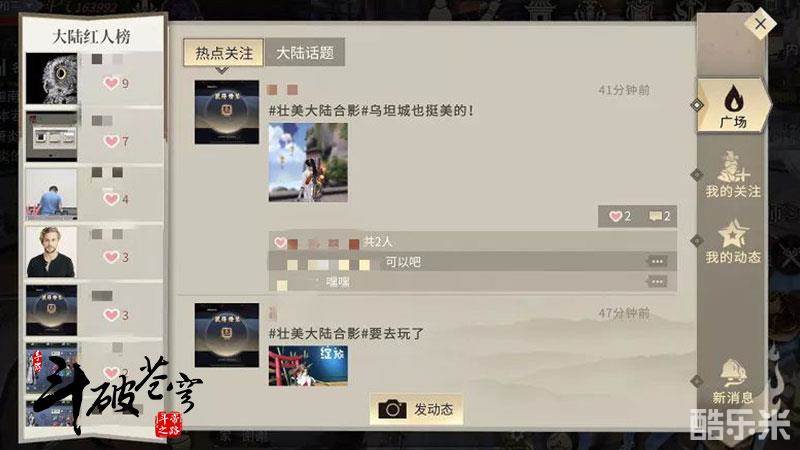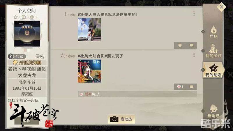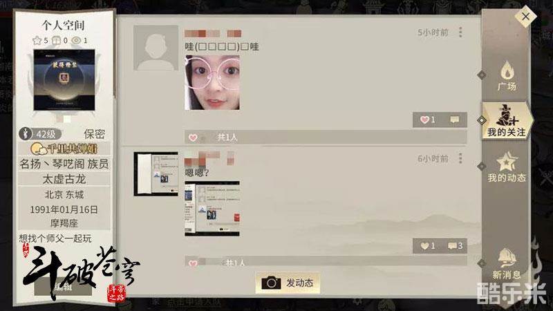同时,在这里你也可以遇到像药老一样靠谱的师傅,点击【发动态】按钮,找师傅、求攻略、展示你在斗气大陆中的所见所闻。此外,在这个交友的空间,会涌现许多斗气大陆的“红人”,将他们添加到【我的关注】中,随时查看他们的最新动态。此外,在这个跨服交友的空间中,遇到同服斗者,,除了添加关注外,还有【加好友】选项,助力所有斗者能够寻觅良师益友。