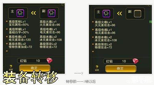 1.顾名思义,装备转移能够将副装备格子中装备的所有随机属性,覆盖掉主装备的所有随机属性。