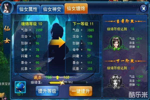 仙女缠绵:使用仙女缠绵丹可提升仙女缠绵等级;缠绵等级达到对应等级时可获得仙女称号:素女<圣女<天女<天仙<女神;缠绵丹可通过商城副本、商城购买获得。