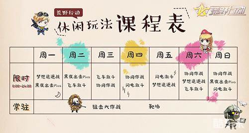 为给玩家们带来更多样的游戏乐趣,在接下来的更新中,《荒野行动》里的七种休闲玩法将按“课程表”轮流“上岗”,陪伴玩家们一同度过每一周的快乐时光:即将上线的狙击大作战和经典的靶场将会是最“辛勤”的常驻玩法;人手空投的梦想追逐战将于每周一、周五和周六登场;落地刚枪的闪电激斗将在每周四、周五和周天开启;而昼夜交替的黑夜出击Plus将于每周一、周二和周天开放……七种玩法交替出场,每天都给你不一样的竞技体验!