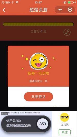 4小编答错一题直接被淘汰了,点击我要复活分享给微信群即可再战。