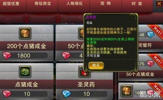 如果玩家是战士的话则需要消耗比较多的血量了,建议跟着角色等级购买对应的血量药剂,否则肉搏时补血不够快,很容易送命。在使用生命药剂的同时,有能力的玩家建议购买商场里的圣灵药,基础回复2000点外加50%生命上限的生命值,回复量相当可观,在生命药剂补给不足时可以吃一瓶圣灵药,马上就能让你的生命值回满。