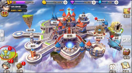 点击红圈内的“女神”,打开女神界面,看下图,左边红色圈内,秩序女神界面是呈绿色的,表示小编已经激活报施女神提西福涅呢