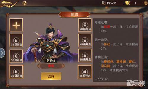 当玩家成长到75级的时候,副将助阵系统将为您开启!从副将界面和布阵界面中都可以进入助阵系统,这次开启的助阵系统真的非常强大,为什么这么说呢?因为副将助阵能够极大的提升武将的属性加成和战力!并且可以提升包括主公在内的所有武将战力!是不是让人非常心动呢?下面就来具体介绍一下这个副将助阵系统。