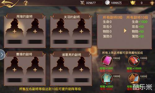 前来助阵的武将共有8个位置,分别为除了主公外4个武将的左右副将,这8位副将必须是橙色及以上的武将,才可以加入助阵。在提升副将等级的时候也要注意,尽量做到均衡发育,因为只有当所有副将统一达到一定等级之后,才可以提升相应的战力哦。提升的战力是包括主公在内的所有武将都能够共享的,另外所有上阵武将还可以获得一定的属性加成哦!