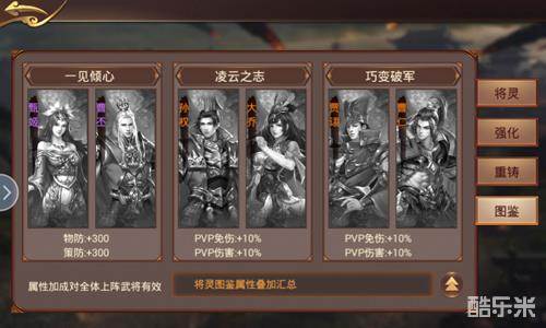 另外,通过获得不同将灵,还可以获得图鉴战力加成,而且这个图鉴战力的属性加成对所有上阵武将都有效果哦,所以一定要尽量多的获取不同将灵。