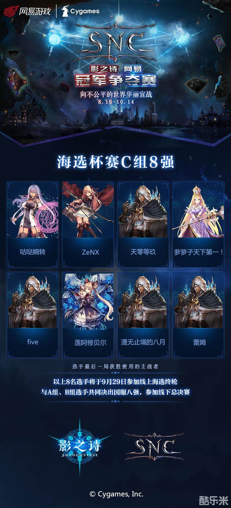 “向不公平的世界华丽宣战!”《影之诗》网易冠军争夺赛(Shadowverse NetEase Championship,简称SNC)海选杯赛C组比赛已于9月23日圆满结束。最终,天零等玖、莲阿修贝尔、ZeNX等8名玩家搭上了本次海选杯赛的最后一班列车,晋级到线上海选的终轮比赛中,将在9月29日与此前A组、B组的晋级选手一同角逐国服八强的席位!