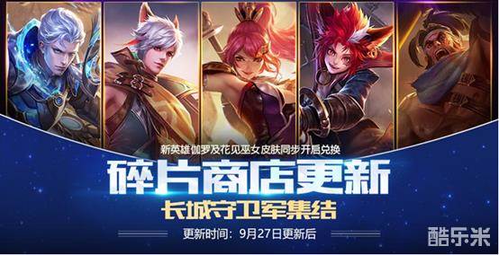 新英雄伽罗及其皮肤花见巫女,长城守卫军花木兰、铠、苏烈、百里守约、百里玄策已在碎片商店开启兑换,喜欢的召唤师们千万不要错过!