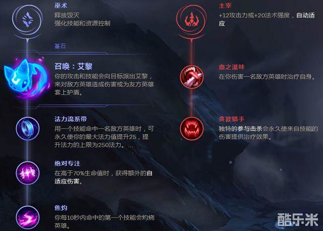 至于其他符文的话,法力流系带能够增加法力值和加强回蓝效果,让伊泽瑞尔可以尽情用技能消耗敌人。绝对专注可以增加伊泽瑞尔的攻击力,W技能也有了额外AD加成。焦灼可以加强伊泽瑞尔的消耗能力,更容易打出对线优势。血之滋味加强伊泽瑞尔的回复能力,让没有偷钱的伊泽瑞尔也有不错的赖线能力。血之滋味更是强化了伊泽瑞尔的回复,让他的技能伤害可以转化为回复效果。如果专注于团战发挥的话,也可以凯旋+致命一击/传说欢欣,而副系选择主宰系则是为了加强对线。