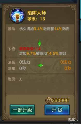 陷阱大师需要在114级以后才能升到15级,永久增加10%的敏捷属性,可以提升弓手的攻击力、暴击率和闪避率,而15%的防御是加强弓手的生存能力,天羽系弓手可以培养体质战魂的血契来增强一下防御能力。