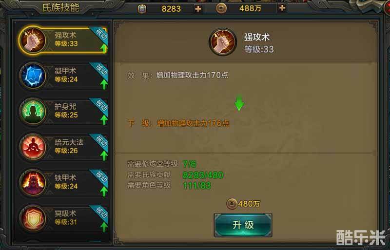 学习氏族技能可以永久增加属性和战斗力,随着氏族技能的等级提升,学习氏族技能花费的铜钱也越来越多。强攻术在33级时,升级到下一级时需要花费480万铜钱,升级后提升的物理攻击仍然是6点,这时候升级氏族技能的性价比不是很高,虽然花费了大量的铜钱,但是战斗力的提升只有几十点,甚至是几点,这时候不妨先把铜钱用来升级战魂血契。在氏族技能等级在30级以前花费的铜钱并不多,我们可以先平均升到25级左右,然后优先将战魂血契升到四重天后,才重新考虑升级氏族技能。