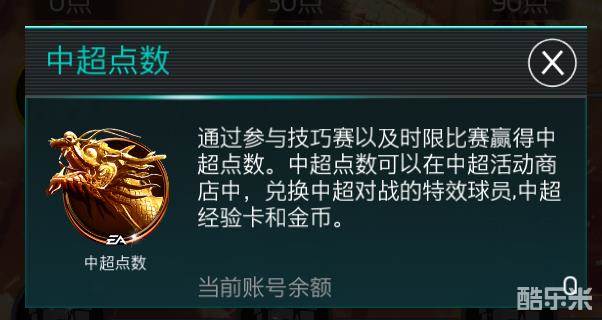 1.中超点数:通过各大赛区的关卡技巧赛和球队特殊关卡获得,用于在俱乐部经纪人处兑换球员等奖励,点数达到条件的可以在活动首页领取相应奖励。