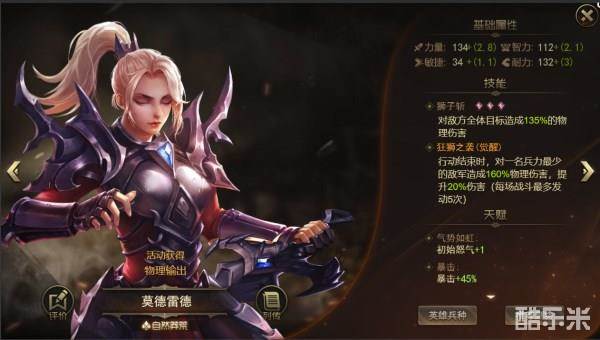 从英雄属性上看,莫德雷德有着其他英雄比不上的强大基础值,高达134的力量基础和132的耐力基础跟很多男性橙将想比都更加出色,加上34的敏捷度,莫德雷德可以称为自然莽荒的第一女战士了。初始属性:☆☆☆☆☆