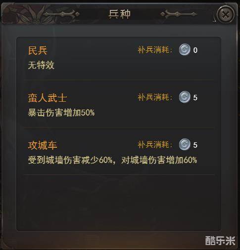 在兵种选择上,莫德雷德的兵种增幅也不错,蛮人武士强调的是对敌方队伍的伤害,而攻城车对城墙的伤害加成也是攻城利器,如果希望快速攻城的话选择攻城车就没错了。兵种实力:☆☆☆☆☆