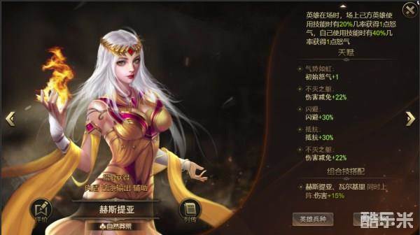 从天赋点看,赫斯提亚有着橙将标配初始怒气+1外,其他的天赋点都点在了闪避和伤害减免上,大大加强了赫斯提亚的炕伤能力,如果领主愿意的话,把赫斯提亚当做一个全肉盾培养也是不错的。天赋实力:☆☆☆☆☆