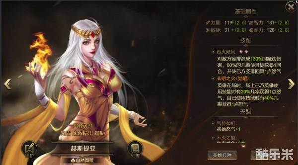 从技能上看,赫斯提亚的技能也是比较倾向于控制流,尽管伤害不高,但是眩晕的概率还是很高的;而觉醒技能就更多是辅助型了,同时看脸的技能,但是这种己方英雄使用技能时都有几率增加怒气的技能还是很可怕的,一不小心就是技能连发了。实力:☆☆☆☆☆