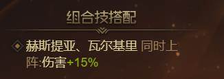 武将缘分组合方面,赫斯提亚的缘分组合就比较弱势了,唯一的选择是和瓦尔基里组合,得到的加成效果也只是15%的伤害加成。缘分实力:☆☆☆☆