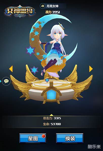 当女神等级(玩家等级)达到9级的时候,女神系统就会开启,点击会进入女神的管理界面,主要有两个模块,星图和换装。