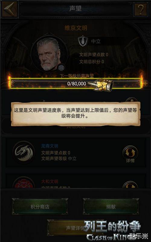 三大文明的国立较量,最核心的要素就是“文明声望系统”。各帝国文明都有声望等级,由低到高分为:仇恨--中立-友善-尊敬-崇敬-崇拜,每个等级都拥有各自强大的属性加成,直接决定了新元素的解锁和帝国的硬实力。玩家将游戏中不断提高声望等级,构成三大文明不断发展壮大的总体格局。