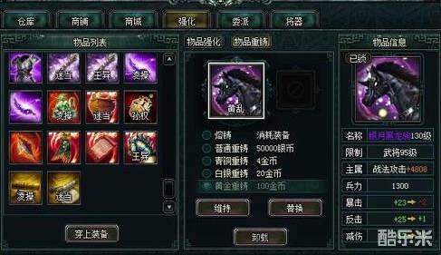 装备重铸分为5种,分别是熔铸、普通、青铜、白银、黄金。后四种按等级划分一目了然,那第一个熔铸是什么呢?消耗装备来提升属性点。所以玩家如果打到了一些垃圾属性的紫装备时,千万别急着卖掉,拿来熔铸,那可是最好的重铸方式,出现增加属性的概率最高!
