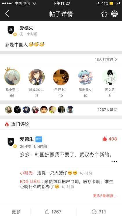lpl的韩援们有不少中国话特别6,如果特别找出来两个代表——那就是ig的肉鸡和京东的doinb。