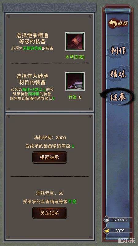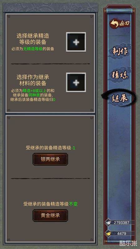 点击“银两继承”按钮将会让受到继承的装备获取的装备加成减少一级。而点击“黄金继承”按钮,就会完成精炼和进化继承。