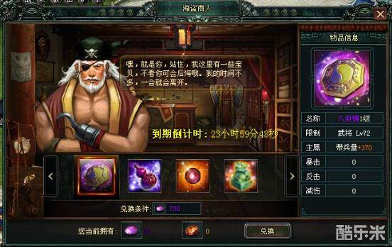 活动期间在主城中将会出现海盗商人,点击他将可兑换稀世珍宝(紫色、橙色兵符)。玩家朋友们,请抓住机会兑换兵符,机不可失失不再来!