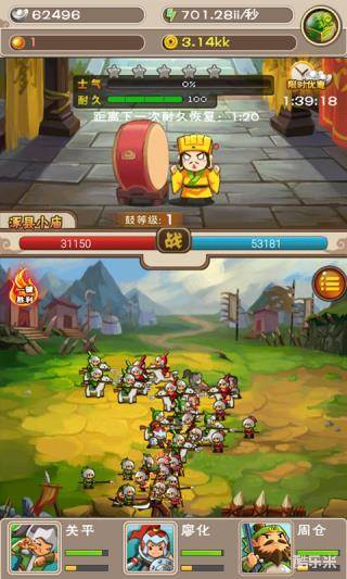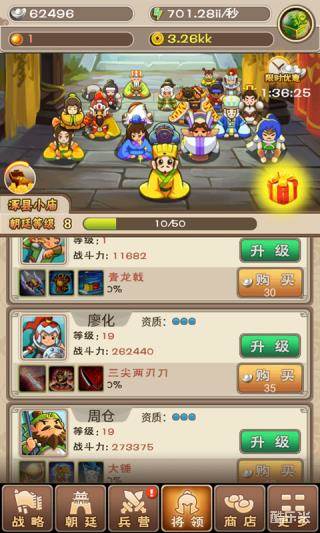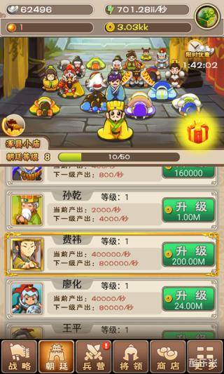 武将系统:在武将界面可以提升武将的等级。一,与兵种相比武将一个巨大的优势就是攻击力高。于此同时战斗时小兵还不怎么喜欢打武将,因此提升武将等级可以很快的提高DPS。二,每一个新解锁的武将都有很高的初始等级。所以玩家们要尽快完成一个州的攻占哦。另外游戏中还有武将计的设定,每个武将都有各自的武将计,不过这个武将计暂时只能花钱购买.