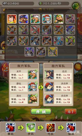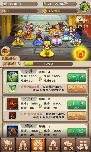兵种升级:在兵营界面我们可以升级兵种。兵种是作战的主力,三个兵种各自都有特色:骑兵擅长突进,秒弓兵秒武将就靠他了;步兵较为平衡,提供稳定的DPS也是一个不错的肉盾;弓兵可以远程输出。就目前小编了解到的而言,主要有两种升级方法:一是主力升级骑兵,钱不够升级骑兵了再升级步兵和弓兵。这种升级方法就是秒兵,秒将快;二是平衡升级,让三种兵都有一定的作战能力。
