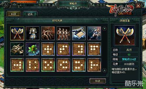 屯兵,即是增加部队的最大不带兵数,当然也是策略府的重要功能之一。不过,策略府还有更重要的功能,例如研究阵型,《卧龙吟》中的所有阵型都出自于策略府,每个阵型都有增加部队不同属性的能力,除此以外,兵刃,铠甲,勇气等等研究项目都能为你的部队提供各不相同的增益,因此想要一支战无不胜的雄师,升级策略府也是十分必要的!