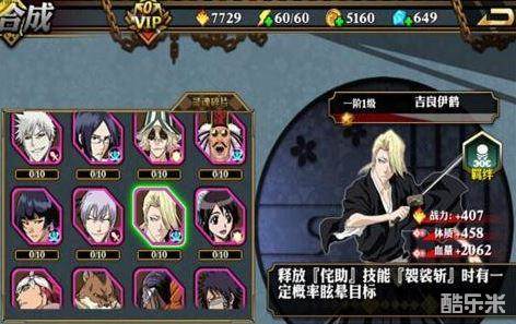 吉良伊鹤的初始属性是较不错一类的,对主角的体质和血量有一定加成,实测眩晕在百分五十左右,护廷十三队三番队副队长,在原队长市丸银叛乱后暂行代理队长一职。在无形帝国的星十字骑士团入侵尸魂界初时,带领队员与之交手,始解后瞬间遭遇攻击,因伤势过重倒地,尔后被涅茧利改造,值的前中玩家去培养,别太深入,平民中后期不推荐。