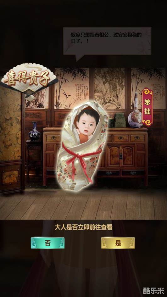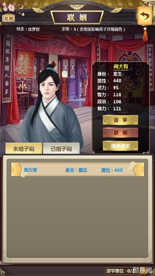 孩子的资质越高,成年后属性也越高,同时你还可以通过联姻(点击媒婆)给孩子找伴侣,小俩口的属性都会算在你的势力值中,虽然不太多,但可以慢慢积累。
