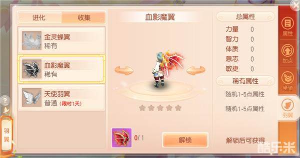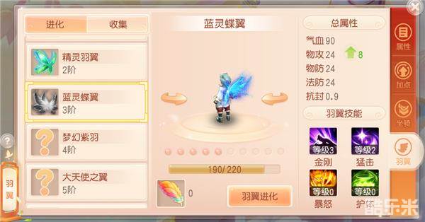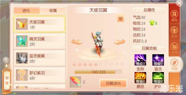 使用羽翼之魂可进化羽翼,羽翼分为10大阶,每个大阶分为10个小阶。每进化到下一个小阶段可获得属性增加,每进化到下一个大阶段可获得属性增加和开启新的羽翼形象。