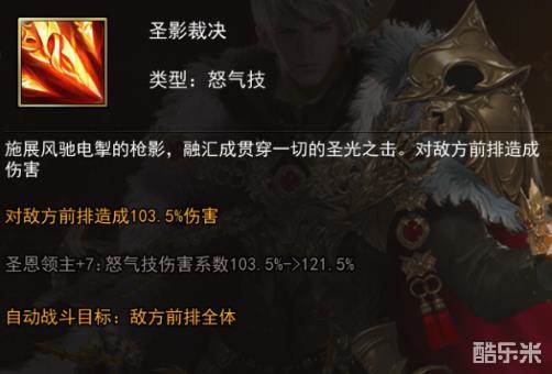 超怒气技:施展风驰电掣的枪影,融汇成贯穿一切的圣光之击。对敌方前排造成103.5%/121.5%伤害。