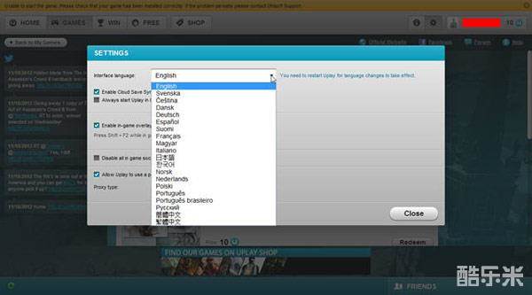 4、输入CDKEY,点OK竟然会说无效,解决的方法就是点击右上角的齿轮按钮进行设置,将language选项中的语言改为english,千万不要用中文,我可以说这是歧视吗?