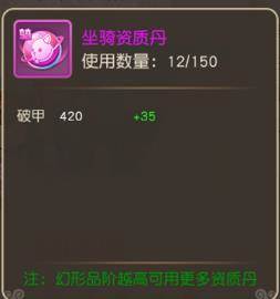 坐骑资质丹可以提升破甲属性,最多使用150次(幻形品阶越高可用更多资质丹)