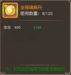坐骑魂魄丹可以提升攻击属性,最多使用120次(幻形品阶越高可用更多魂魄丹)