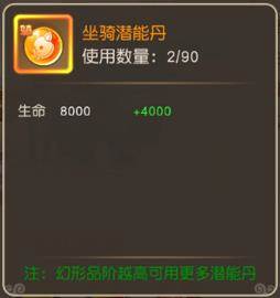 坐骑潜能丹可以提升生命属性,最多使用90次(幻形品阶越高可用更多潜能丹)