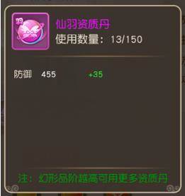 仙羽资质丹可以提升防御属性,最多使用150次(幻形品阶越高可用更多资质丹)