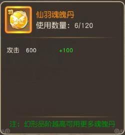 仙羽魂魄丹可以提升攻击属性,最多使用120次(幻形品阶越高可用更多魂魄丹).
