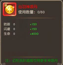 仙羽神源丹可以提升防御、闪避、生命属性,最多可以使用60次(幻形品阶越高可用更多资质丹)