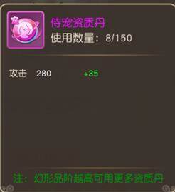 侍宠资质丹可以提升攻击属性,最多使用150次(幻形品阶越高可用更多资质丹)