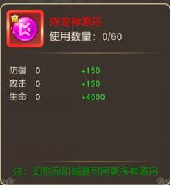 侍宠神源丹可以提升防御、攻击、生命属性,最多可以使用60次(幻形品阶越高可用更多资质丹)