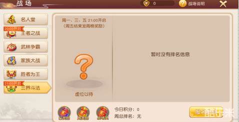 点击游戏主界面右侧“战场”图标即可看到菜单,第六个选项就是“三界斗法”