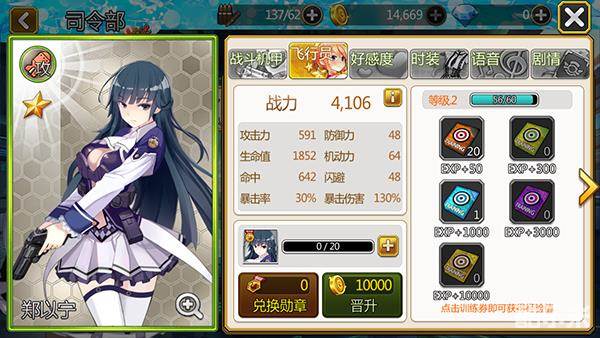 6、这款游戏的角色等级经验是随着你使用的体力的消耗而增长的,所以当你有富裕的弹药(体力)的时候可以直接扫荡世界地图的剧情副本,从而提升自己的角色等级,这样飞行员的等级及技能上限可以第一时间获得提升;