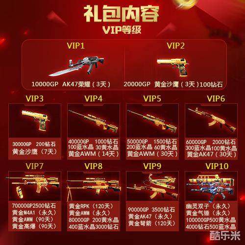 VIP系统作为给玩家谋福利的良心服务,在除了上述提到的功能外,获得VIP资格的玩家还将获得与之相对应的武器以及其他奖励,在游戏中随着VIP等级的提升,你不仅能够拿到海量的金币,甚至还有所有玩家梦寐以求的黄金系列武器。