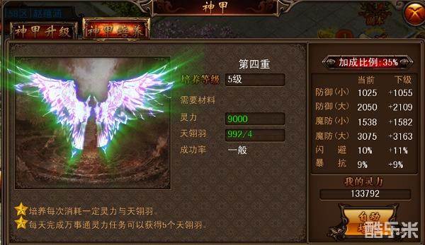 神甲培养的重数越高,通过神甲获得的属性值则越高,培养神甲需要消耗灵力和天翎羽。