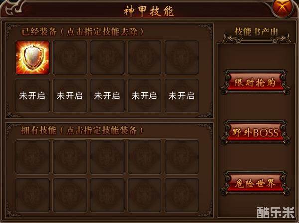 神甲技能可以通过实现限时抢购、野外boss、危险世界来获得。