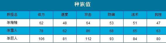小编点评:冰巨人,身为冰系首只宠物,样子够萌,实力够强!神技蓄势,自身攻击和速度各提升一级,瞬间逆转对手获得胜利。冰天雪地,能够让对手进入冰冻状态,一旦被冰冻后,对手将不能使用道具,不能更换妖怪。攻击、体力、防御种族值都很高,必练哦!