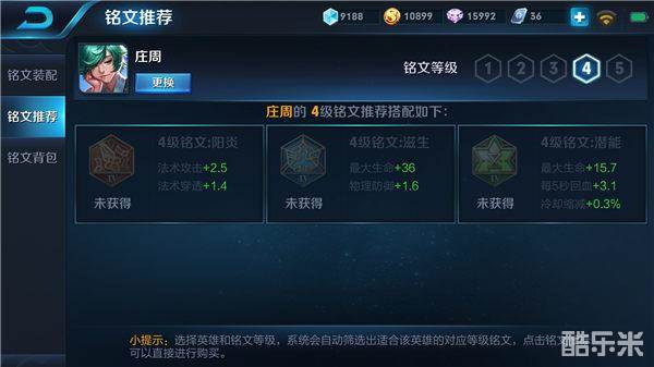 五级铭文的推荐中,因为庄周的技能需要足够的法术攻击加成,所以就首先为庄周搭配增加53点法术攻击的圣人铭文,这个铭文的携带能使庄周前期作战能力更强,让敌人不敢小瞧庄周的伤害;蓝色铭文长生为庄周增加750点最大生命值,无论哪个时期都使庄周承受伤害的能力优于敌方英雄,这里需要说的是如果你对自己的操作有把握,那么蓝色铭文还可以选择轮回,增加的法术攻击使庄周的输出更加强势,法术吸血则让庄周的续航能力更为强大;绿色铭文均衡带来物理和法术防御各50点,增强庄周的承受伤害能力,使庄周无论面对敌方物理输出还是法师英雄都能从容不迫,如果装备中选择出纯防御装备,那么也可以选择怜悯铭文,配合装备使冷却缩减达到饱和值。铭文的选择要配合出装,所以一旦确定了铭文,那么就要有针对的弥补一些属性的不足,这样才能在战场上做到游刃有余。